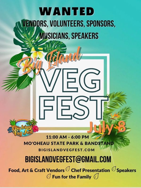 Join us as a Vendor, Volunteer, Sponsor, Musician or Speaker. To find out more, email: bigislandvegfest@gmail.com